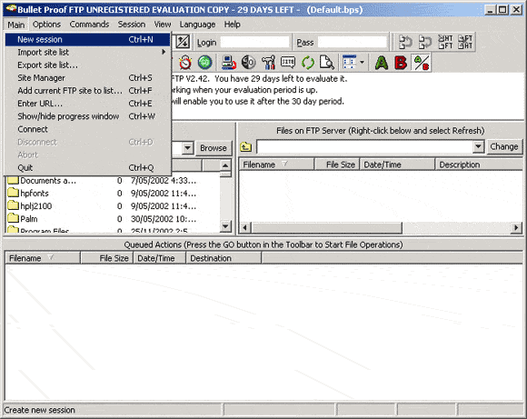 1. Open BulletProof FTP and select 'Main' from the drop down menu and select 'New Session'.