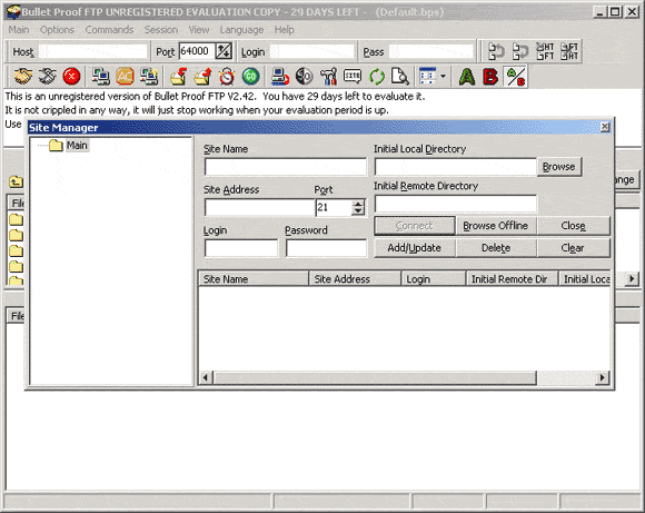 With Bullet Proof FTP, interrupted file transfers are easy to resume. Should you encounter a disconnection when downloading files, Bullet Proof FTP will automatically reconnect and resume downloading. Features include automatic disconnection after downloading files, a queue that supports drag and drop, and a tray icon that displays the progress of file transfers. This program can also outsmart FTP servers that limit the number of files you can download in a session by automatically disconnecting and reconnecting until all of your desired downloads are complete. Click here to