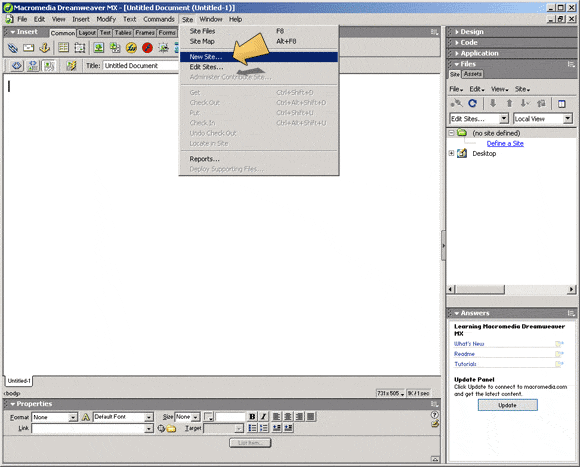 1. Open Dreamweaver and from the main menu 'Site' option, select 'New Site'. A new dialog box will appear.