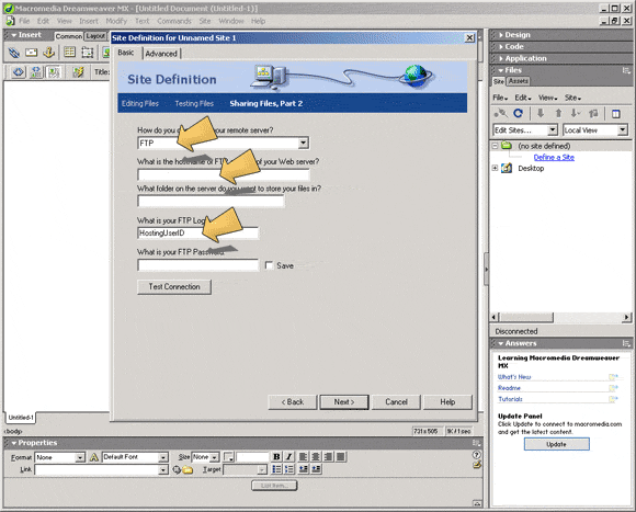 We will setup Dreamweaver MX to use your machine as a test server to develop your website locally. Once finished, Dreameaver will publish your website to our production servers.
