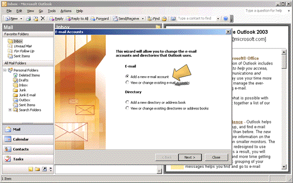 3. Check the 'Add a new e-mail account' radio button and click 'Next >'.