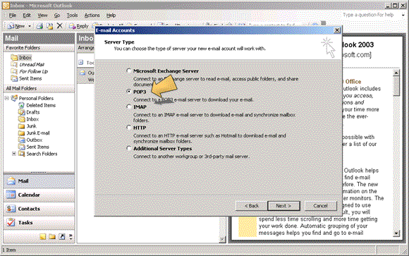 4. Check the 'POP3' radio button and click 'Next >'.