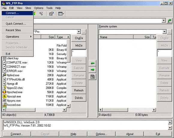 1. Open WS_FTP and click on the 'File' drop down menu and press 'Connect...'.