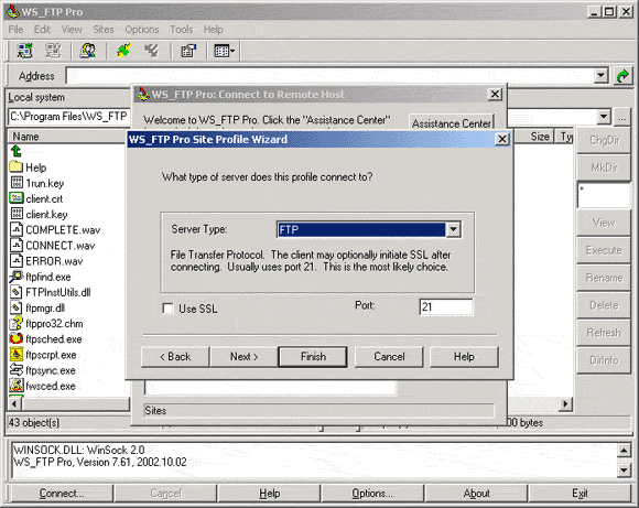 6. Make sure FTP is selected in the 'Server Type' Drop Down menu, make sure 'SSL' is unchecked and click 'Finish'.